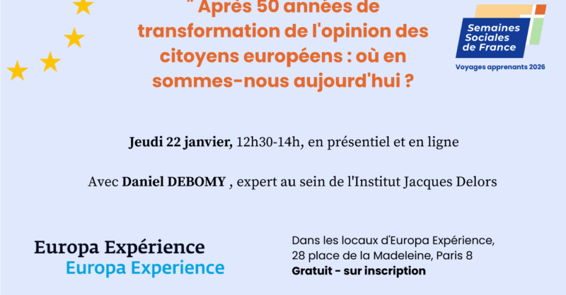 La conférence se tiendra dans les nouveaux locaux d’Europa Expérience, 28 place de la Madeleine le 22 janvier de 12h30 à 14h00, débat animé par Jérôme Vignon, président d’honneur des Semaines sociales de France.