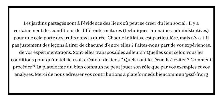 Le jardin est un lieu de rencontre exceptionnel entre écolos, bobos, personnes originaires d’Afrique du Nord, immigrés de fraîche date, chibanis et anciens mais c’est un lieu vivant qu’il faut gérer en permanence ; créer un jardin partagé, c’est relativement facile, le faire vivre c’est une aventure permanente. Nous ne sommes pas dans un système social administré mais dans une école de vie qui suppose une organisation des acteurs, une répartition de responsabilité et le cas échéant la mise en place d’un superviseur.